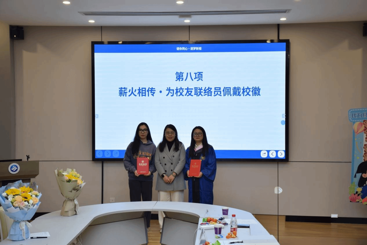 接下来,同学们向学院捐赠了书籍,以书香传递爱心、延续传承,分享收获的喜悦。同时,大家积极践行“我为母校发展建言献策”,将对母校的殷切建议与美好祝福写在寓意马到成功的卡片上。随后,孙瑜向2026届校友联络员佩戴校徽并颁发聘书。