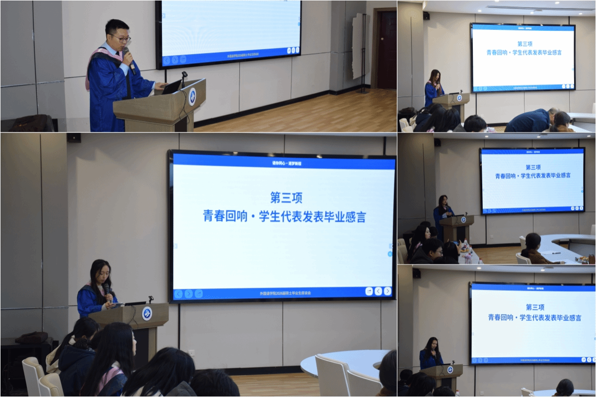 辅导员赵青介绍了本届毕业研究生的就业概况,与会同学亦逐一介绍了各自的就业方向。随后,各专业学生代表依次发言,他们结合自身经历,分享了在学校和学院的支持下,在跨文化交流、学术研究以及社会实践中的收获与感悟,以及从迷茫困惑到从容成熟的蜕变历程,表达了对母校培育、恩师教诲的感激之情。