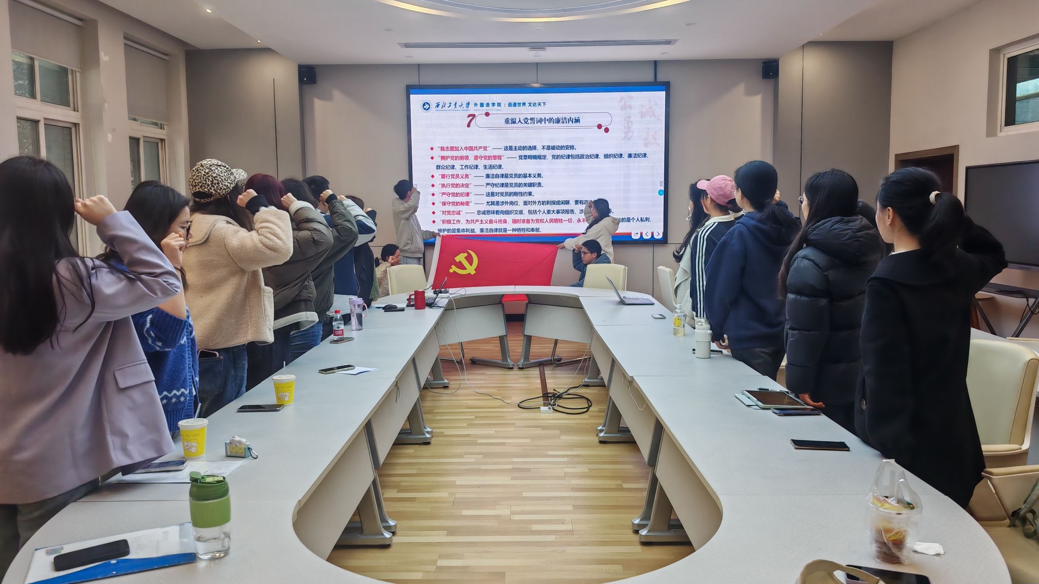 张桑桑阐释了党中央对新时代廉洁文化建设的重要指示,带领全体毕业党员再次学习了《中国共产党廉洁自律准则》中的“四个坚持”、“四个自觉”与《中国共产党纪律处分条例》中廉洁纪律的核心内容,明确厉行勤俭节约、严守廉洁底线、增强自律意识的核心要求,强调落实中央八项规定精神的重要意义。同时,通过真实案例剖析,让毕业生党员深刻认识到廉洁自律的重要性和违纪违法的危害性,做到警钟长鸣、引以为戒。针对毕业生党员的实际情况,她明确了践行廉洁的行动指南,提出离校前需做好“廉洁三件事”,入职后要坚守“廉洁三底线”。最后,全体毕业生党员面向党旗重温入党誓词,以铮铮誓言许下廉洁从业、坚守初心的郑重承诺。