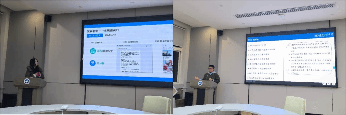 沈欣怡结合自身在互联网大厂的实习经历,分享了从简历投递到最终留用的实战经验。她重点讲解了如何精准定位岗位、准备笔面试以及在实习中争取转正机会,为希望进入互联网行业的同学提供了宝贵的建议。黄昱琪以进入互联网大厂担任人力资源HR的经历为主线,分享了跨专业求职的心路历程与实操经验。他从岗位认知、简历优化、面试准备到实习转化等方面进行了深入交流,鼓励同学们在求职中勇于尝试、找准自身优势。
