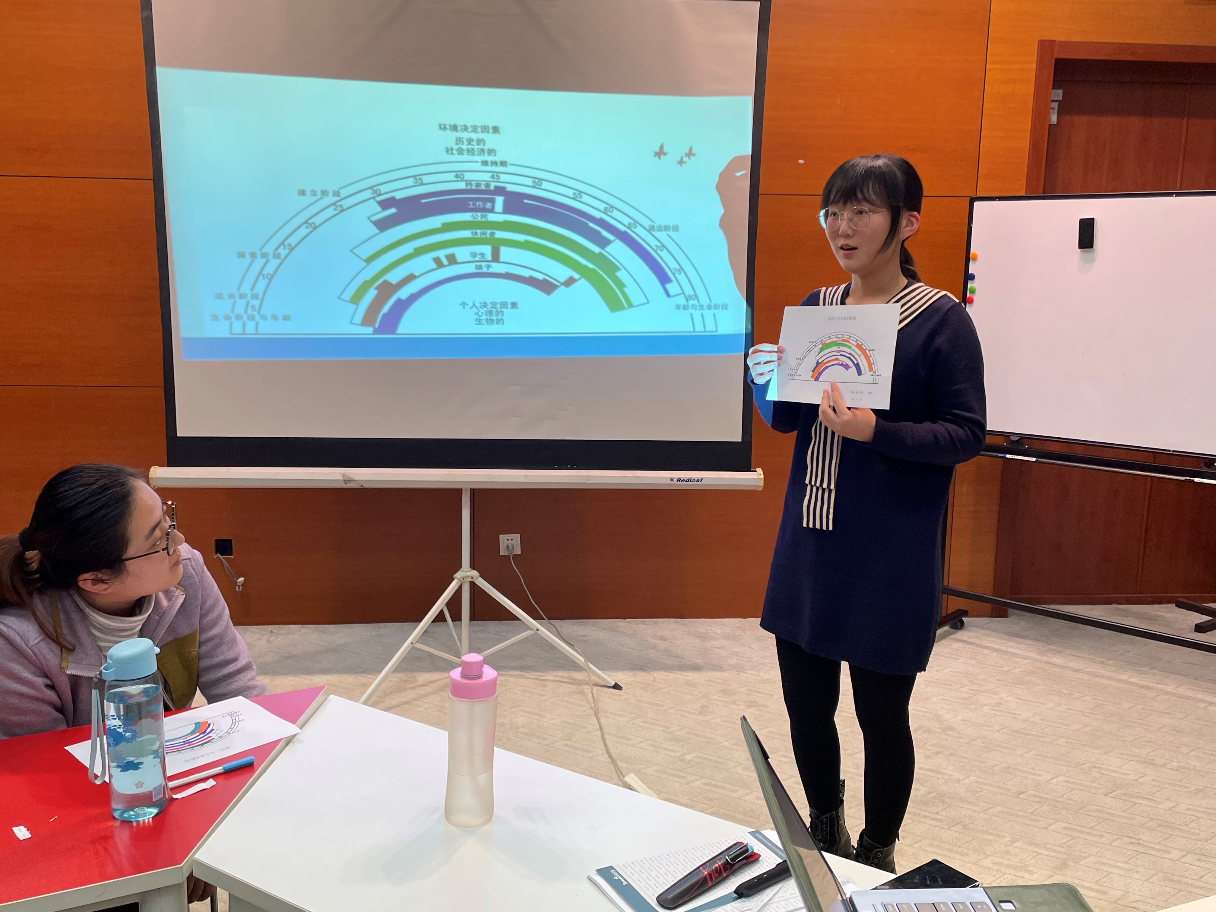 活动开始,张宁用一张年龄刻度图生动形象的为同学们指出了生涯规划的重要性。她指出,25岁至35岁是每个人职业生涯中最重要的10年,需要大家好好把握。紧接着,她又讲解了舒伯的生涯彩虹图并让同学们动手实践,绘制自己的生涯彩虹图。在认真思考与绘制后,同学们分组交流了自己的思考,张诗卉同学主动为大家分享了自己的作品,并得到张宁老师的肯定。