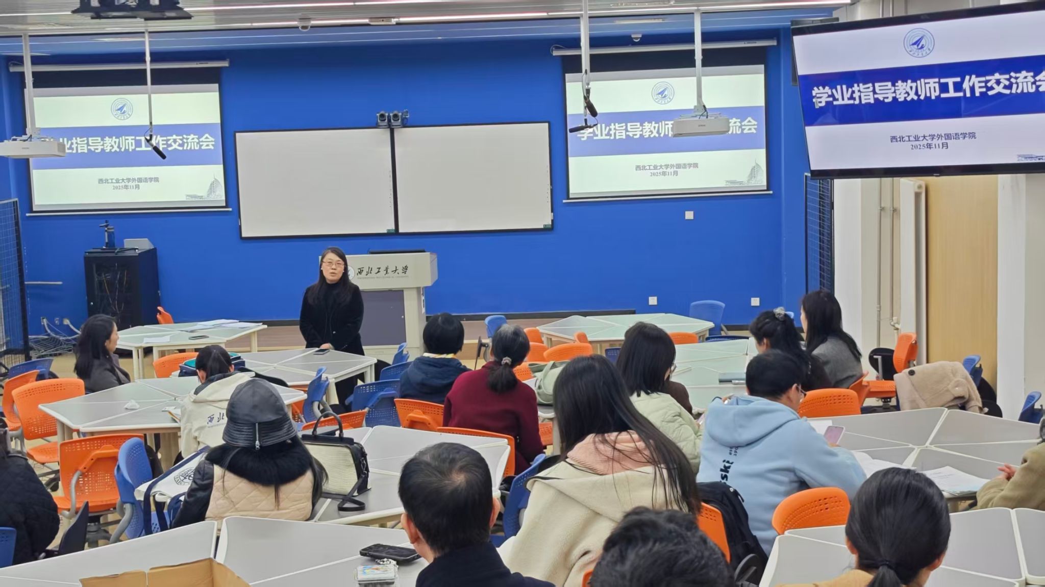 于11月25日中午在国际化社区组织召开2025级本科生与学业指导教师交流会。学院领导班子全体成员、学业指导教师及2025级全体本科生齐聚一堂,共话学业发展蓝图。
